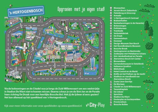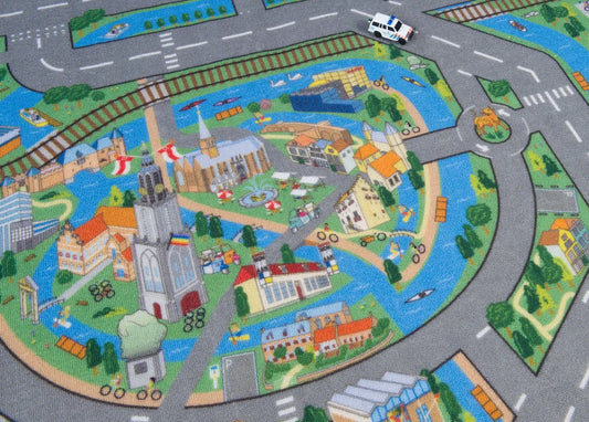 De speelkleden, ook wel verkeerskleed, vloerkleed autoweg, autokleed, speeltapijt en vloerkleed auto genoemd, zijn leerzaam, leuk en herkenbaar. Voor kinderen maar ook voor volwassenen door de unieke details en specifieke kenmerken die door de illustrators worden verwerkt. Met minimaal 25 iconen per stad en het gebruik van mooie kleuren, haal je een uniek item in huis. Ieder speelkleed is geschikt voor vloerverwarming, is hoogwaardig afgewerkt met anti-slip aan de onderzijde en is recyclebaar. De speelkleden zijn gemaakt van anti allergenen en milieuvriendelijke stoffen.